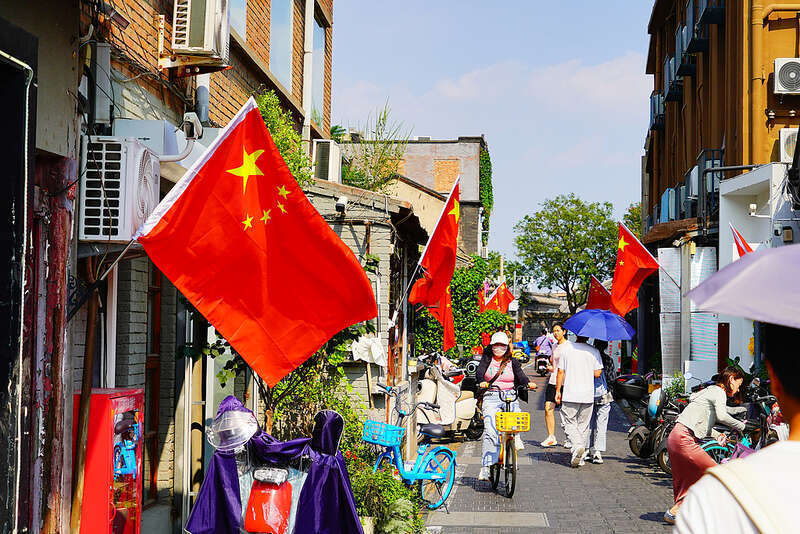 2025年8月31日,北京,为招待中国东说念主民抗日战争暨寰宇反法西斯战争得手80周年,杨梅竹斜街换上“中国红”,一面面清秀的五星红旗吊挂上沿街住户院落和商户门前,为操心作为凝华浓厚社会氛围。图片开头:CFP