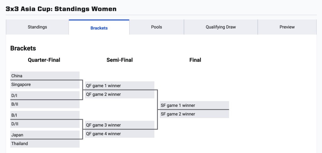 淘汰赛对阵,中国女队将在四分之一决赛中对阵新加坡队。图片来自海外篮联三东说念主篮球官网